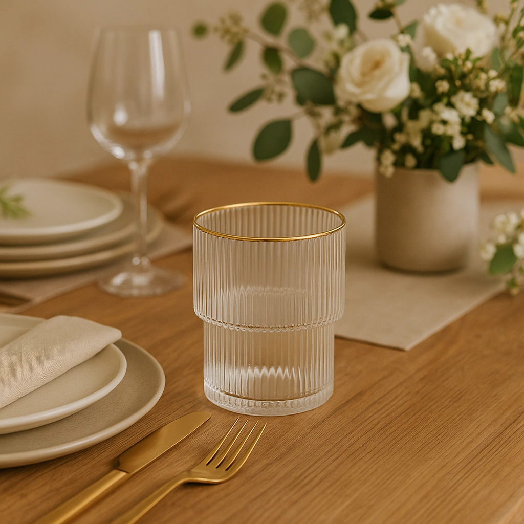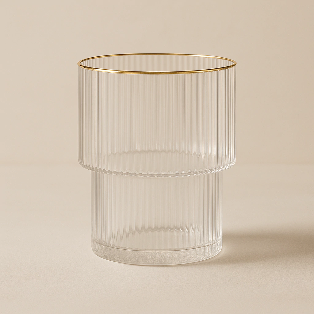 Com linhas verticais em relevo e formato cilíndrico moderno, os copos combinam o brilho sutil do cristal com a sofisticação do acabamento metálico dourado. A base mais espessa garante estabilidade, e o tamanho compacto os torna ideais para servir drinks, água aromatizada ou cafés especiais com apresentação diferenciada.