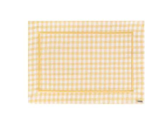 Lugar Americano Xadrez Camomila. Medidas: 50 x 36cm. Tecido Jacquard com bordado em todo o contorno. Composição: 78% algodão e 22% poliéster. Cuidados: Lavar em água na temperatura ambiente. Não usar alvejantes. Não secar em secadora.